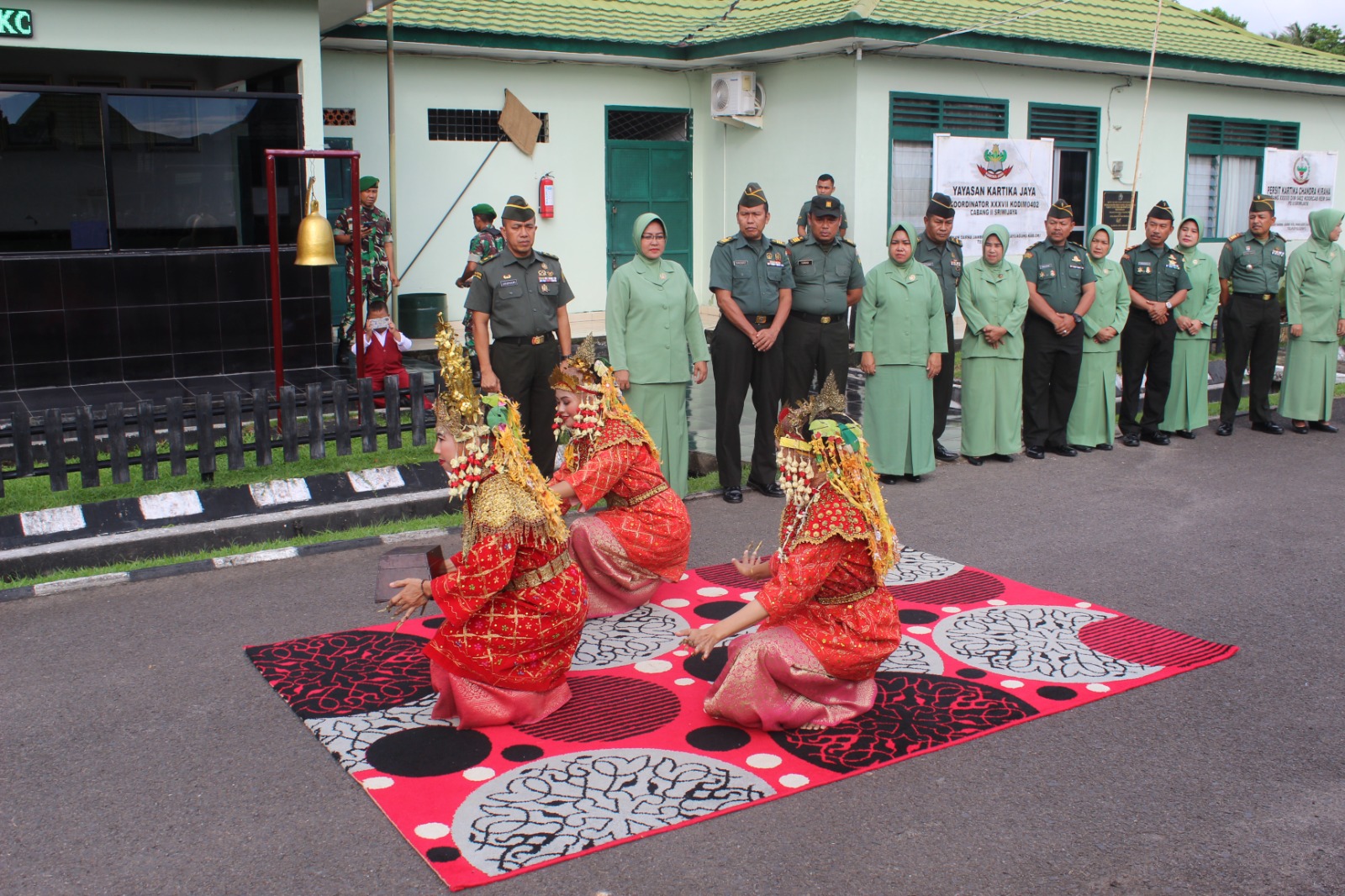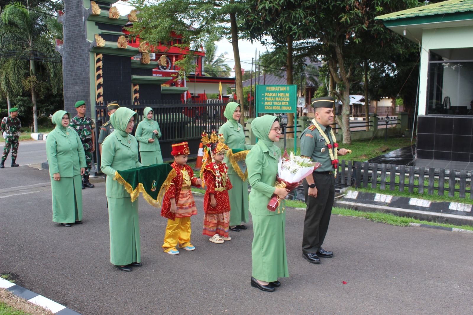 Tradisi penyambutan langsung di terima oleh Kasdim 0402/OKI Mayor Czi Saipul Anwar beserta istri di depan gerbang Makodim. Setelah itu, dilanjutkan dengan laporan dari Perwira Jaga Makodim 0402/OKI dan pengalungan bunga oleh siswa-siswi TK Kartika.