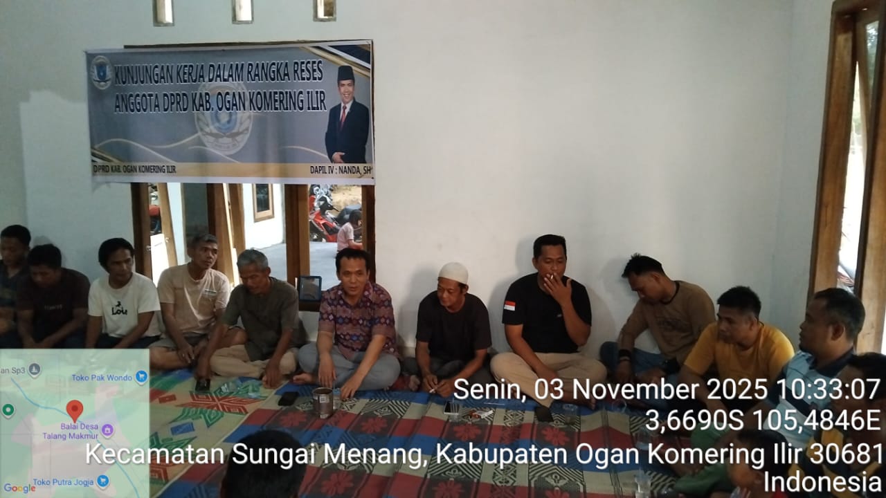 SUNGAI MENANG, PUKANEWS.COM – Anggota Dewan Perwakilan Rakyat Daerah (DPRD) Kabupaten Ogan Komering Ilir (OKI) dari Fraksi Partai Gerindra, Nanda, S.H., menggelar kegiatan Reses I Tahun Sidang 2025–2026. Pertemuan untuk menyerap aspirasi ini dilaksanakan di Desa Talang Makmur, Kecamatan Sungai Menang, yang merupakan bagian dari Daerah Pemilihan (Dapil) 4.