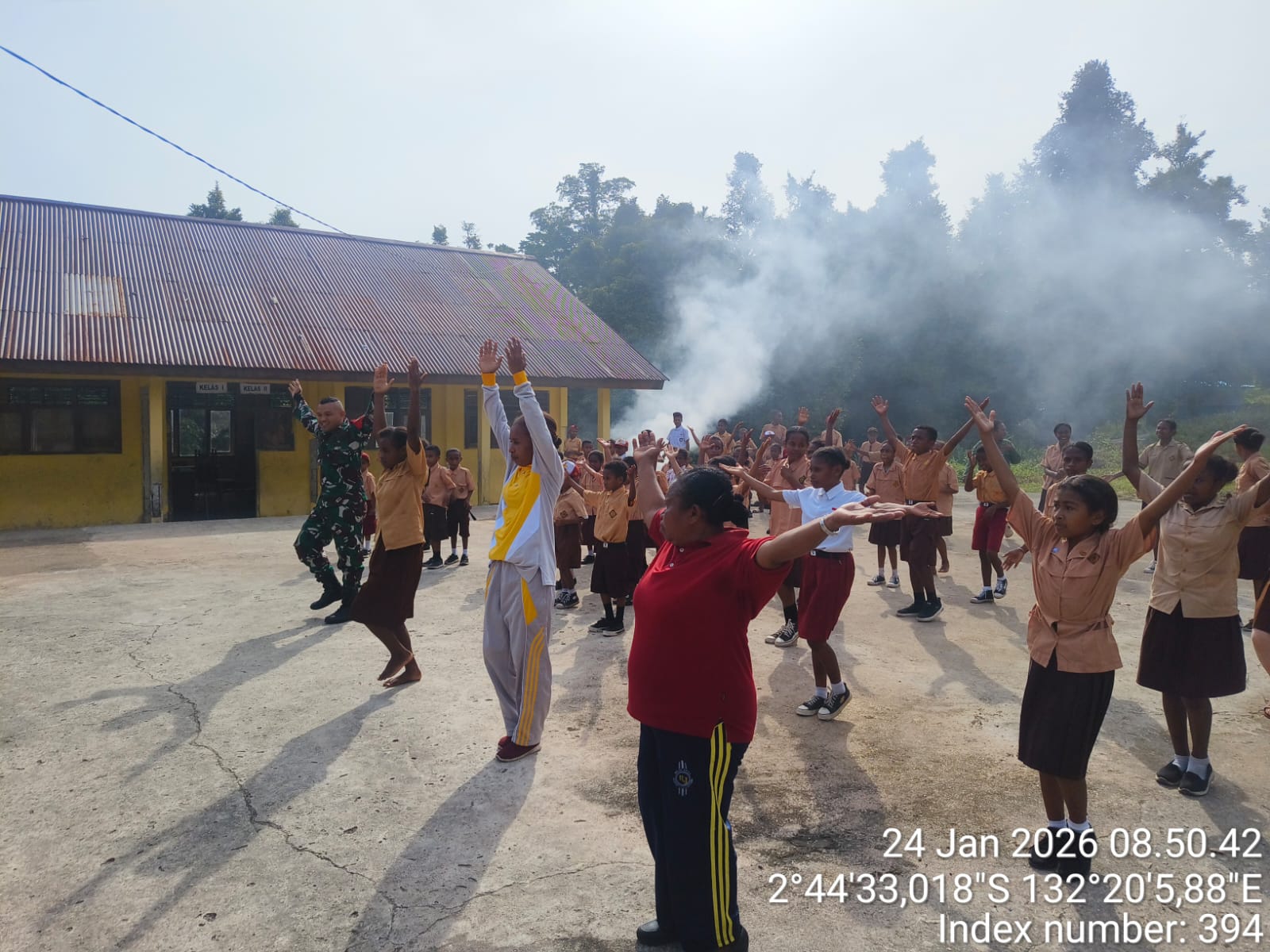 FAKFAK, PAPUA BARAT, PUKANEWS — Dalam upaya mendukung tugas pembinaan teritorial sekaligus memperkuat kemanunggalan TNI dengan rakyat sejak usia dini, Babinsa Koramil 1803-07/Kramomongga menggelar kegiatan senam bersama siswa-siswi SD Nawatukar, Distrik Kayauni, Kabupaten Fakfak, Papua Barat, Sabtu (24/1/2026).