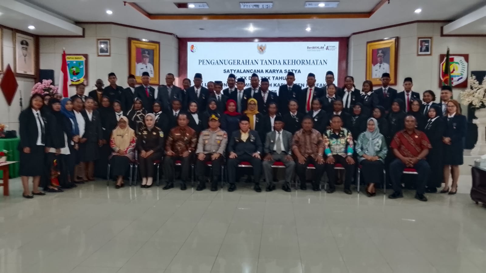 FAKFAK, PAPUA BARAT, PUKANEWS.COM — Pemerintah Kabupaten Fakfak menganugerahkan tanda kehormatan Satyalancana Karya Satya kepada 79 Aparatur Sipil Negara (ASN) atas pengabdian mereka selama puluhan tahun. Penyematan penghargaan tersebut dilakukan langsung oleh Bupati Fakfak Samaun Dahlan bersama Wakil Bupati Donatus Nimbitkendik dalam seremoni yang digelar di Gedung Winder Tuare, Kamis (4/12/2025).