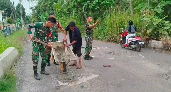 PukaNews, OKI – Koramil 402-03/SP Padang Kodim 0402/OKI–OI bersama masyarakat melaksanakan kegiatan penambalan jalan berlubang di beberapa titik ruas jalan di wilayah Kecamatan SP Padang, Kabupaten Ogan Komering Ilir (OKI), Senin, 16 Maret 2026.