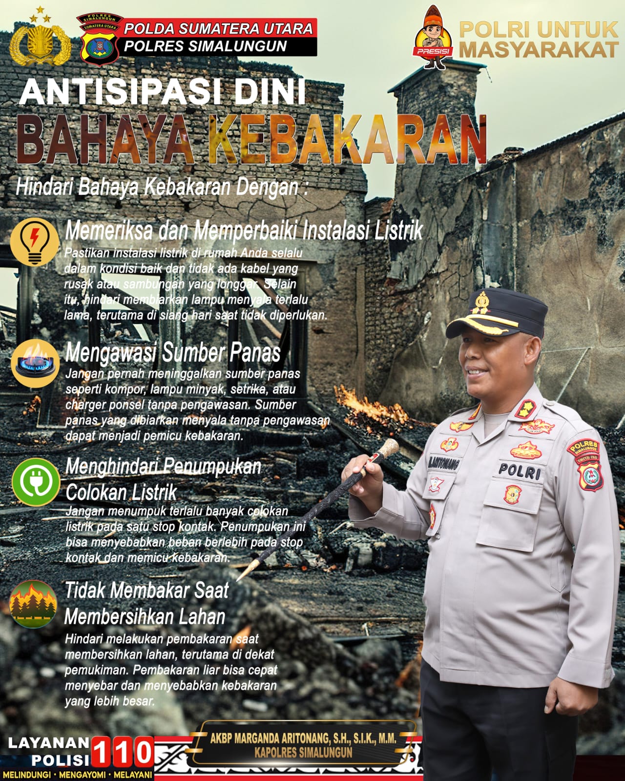 Di akhir penjelasannya, Kapolres memberikan pesan yang sangat personal kepada masyarakat. “Dengan menerapkan langkah-langkah pencegahan ini, kita dapat mengurangi risiko kebakaran dan menjaga keamanan rumah serta keluarga. Rumah adalah istana kecil kita, tempat keluarga tercinta berada. Jaga dengan baik, jangan sampai kelalaian kita menghancurkan segalanya,” pungkas AKBP Marganda Aritonang menutup himbauan pentingnya dengan penuh kepedulian terhadap keselamatan masyarakat Simalungun.