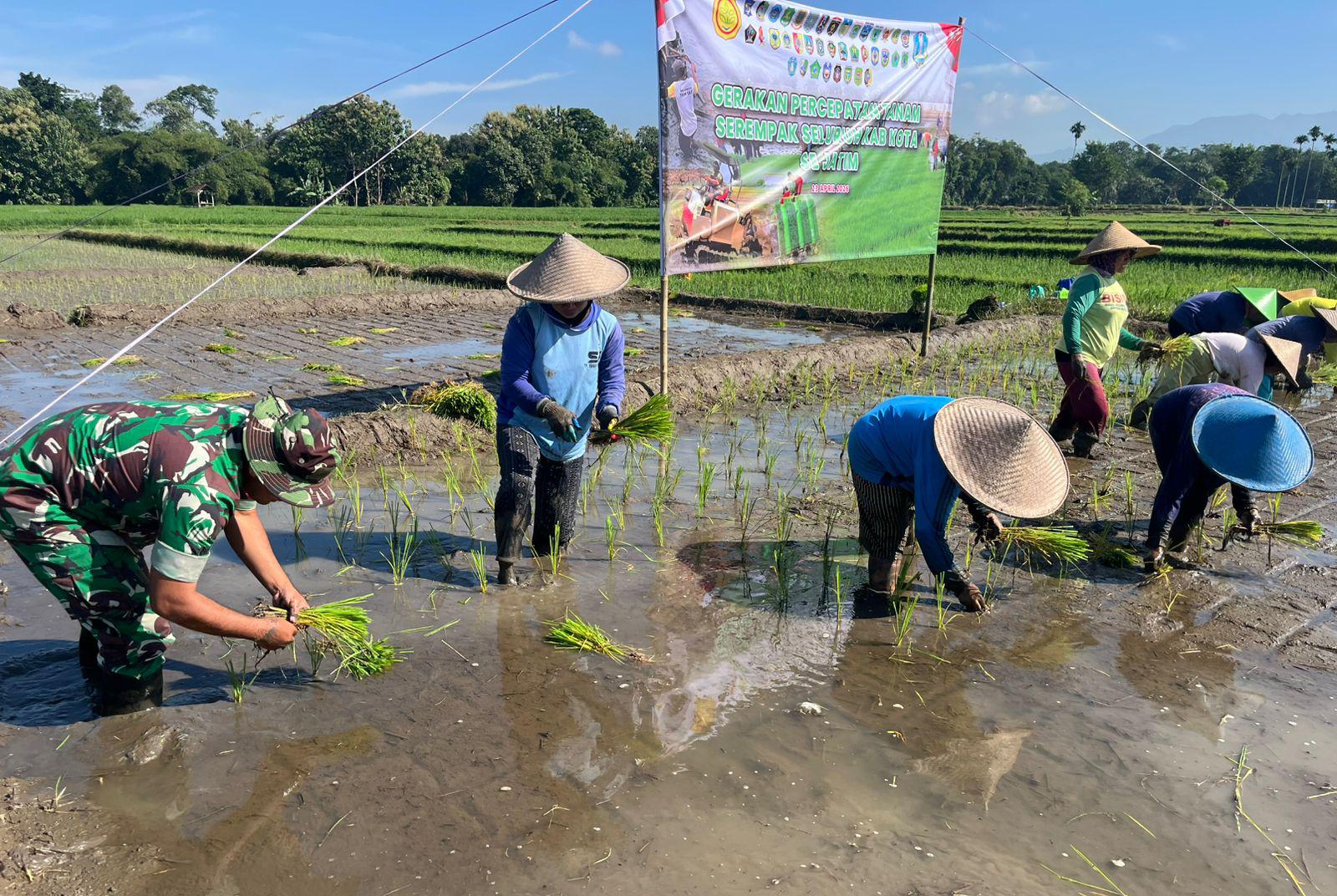 PukaNews.com, Blitar — Dalam upaya memperkuat ketahanan dan swasembada pangan nasional, Babinsa Desa Butun Koramil 0808/15 Gandusari Kopka Yoko S terjun langsung membantu petani dalam kegiatan tanam padi serentak se-Jawa Timur. Kegiatan ini dilaksanakan bersama Forkopimda Kabupaten Blitar dan Forkopimcam Gandusari di Dusun Jetis, Desa Butun, Kecamatan Gandusari, Kamis (23/4/2026).