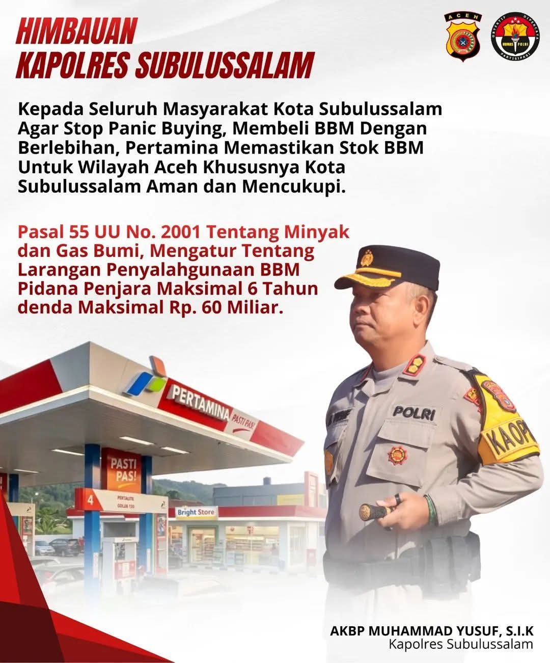 PukaNews, Subulussalam -– Sosok Kapolres Subulussalam, Muhammad Yusuf, tampil memberikan imbauan penting kepada seluruh masyarakat agar tidak melakukan pembelian Bahan Bakar Minyak (BBM) secara berlebihan atau panic buying.