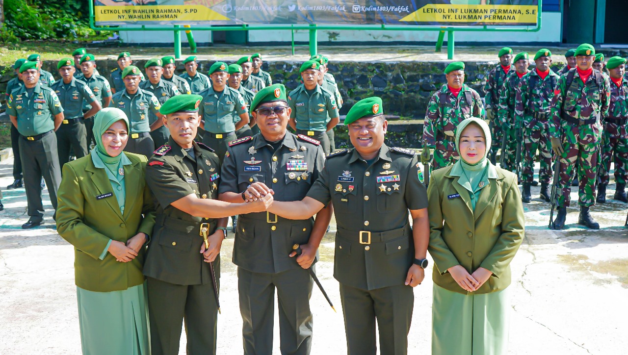 Jabatan Dandim 1803/Fakfak resmi diserahterimakan dari Letkol Inf Lukman Permana, S.E., kepada penggantinya Letkol Inf Wahlin Rahman, S.Pd. Sertijab turut dirangkaikan dengan tradisi satuan serta penandatanganan berita acara serah terima jabatan Ketua Persit Cabang XIV Kodim 1803/Fakfak, Koorcabrem 182 PD XVIII/Kasuari.