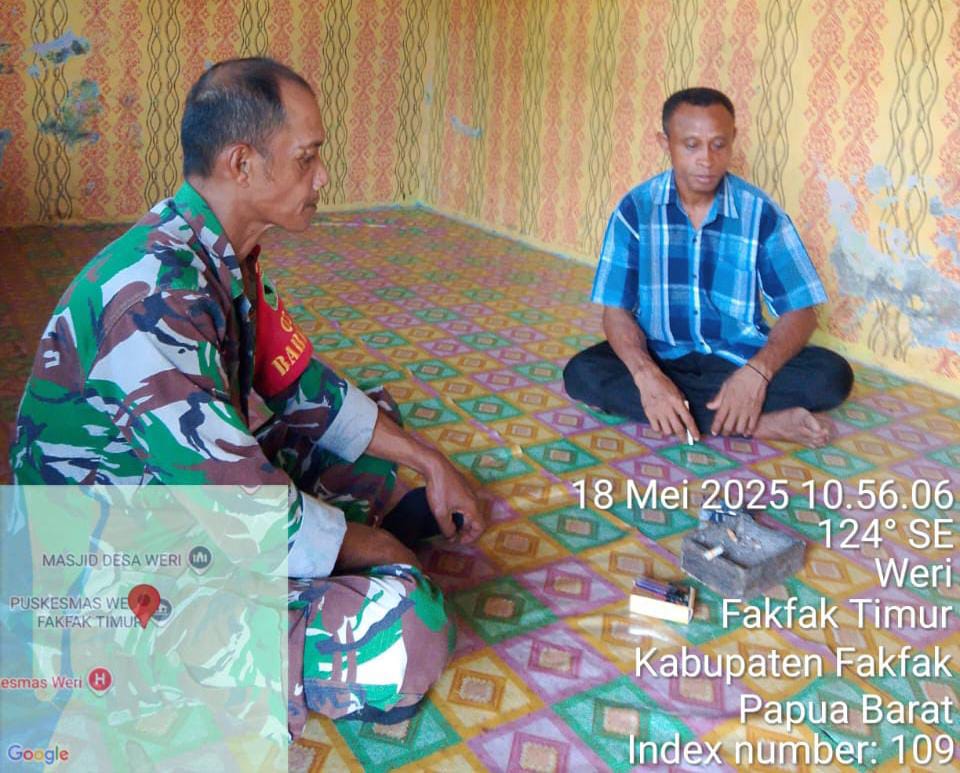 kegiatan Komsos dilakukan bersama Bapak Yosep Laritmas, Tokoh Agama Masyarakat di Kampung Weri Distrik Fakfak Timur Kab. Fakfak untuk mensosialisasikan Undang-Undang (UU) TNI yang baru disahkan.