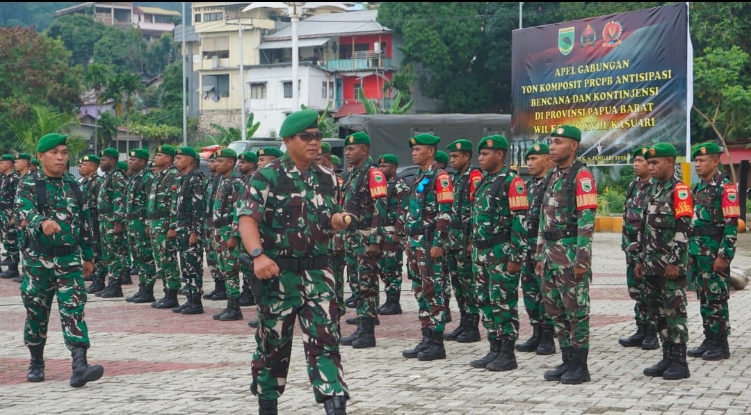 FAKFAK, PAPUA BARAT, PUKANEWS – Komando Resor Militer (Korem) 182/JO menggelar Apel Gelar Antisipasi Siaga Kontijensi Bencana Pasukan Reaksi Cepat Penanggulangan Bencana (PRCPB) sebagai bentuk kesiapsiagaan menghadapi potensi bencana alam di wilayah Provinsi Papua Barat, khususnya Kabupaten Fakfak.
