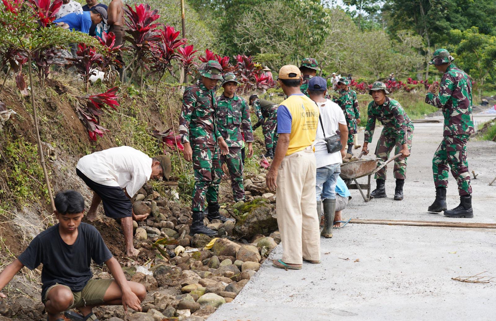 Anggota Satgas TMMD Ke 127 Kodim 0808/Blitar bersama warga melaksanakan gotong royong untuk pemasangan berem jalan sebagai bagian dari tahapan penyempurnaan pembangunan infrastruktur jalan yang menghubungkan dusun krisik dan dusun wonorejo Desa Krisik Kecamatan Gandusari Kabupaten Blitar.