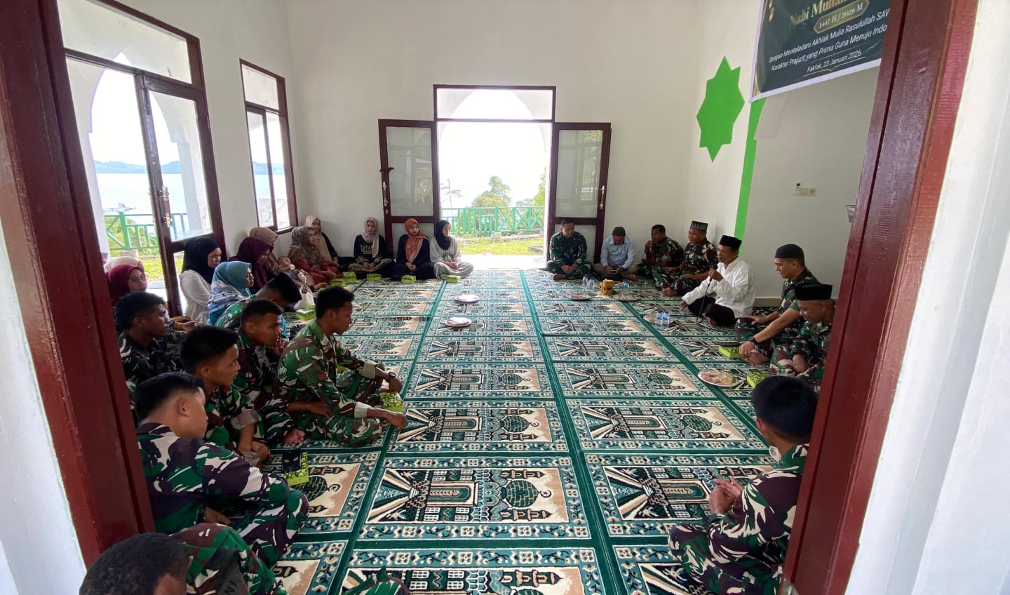 Prajurit Korem 182/Jazira Onim mengikuti peringatan Isra Mi’raj Nabi Muhammad SAW 1447 H di Masjid Al Ikhlas Makorem 182/JO, Fakfak, Papua Barat, Jumat (23/1/2026). Danrem 182/JO mengajak prajurit menjadikan nilai-nilai akhlak Rasulullah SAW sebagai landasan pengabdian menuju Indonesia Maju. (FOTO: PENREM 182/JO)