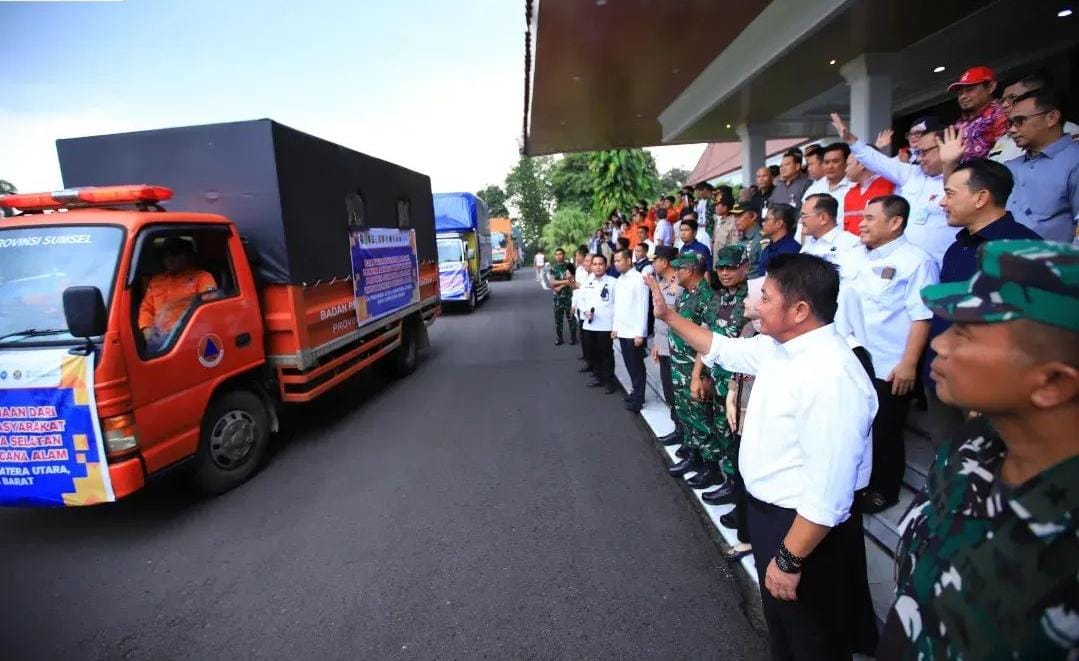 PALEMBANG, PUKANEWS.COM Gubernur Sumatera Selatan, H. Herman Deru, secara simbolis melepas rombongan bantuan kemanusiaan dari Pemerintah Provinsi Sumsel dan masyarakat Sumsel untuk korban bencana alam di Provinsi Aceh, Sumatera Utara, dan Sumatera Barat. Acara pelepasan berlangsung di Griya Agung, Rabu (3/12/2025).