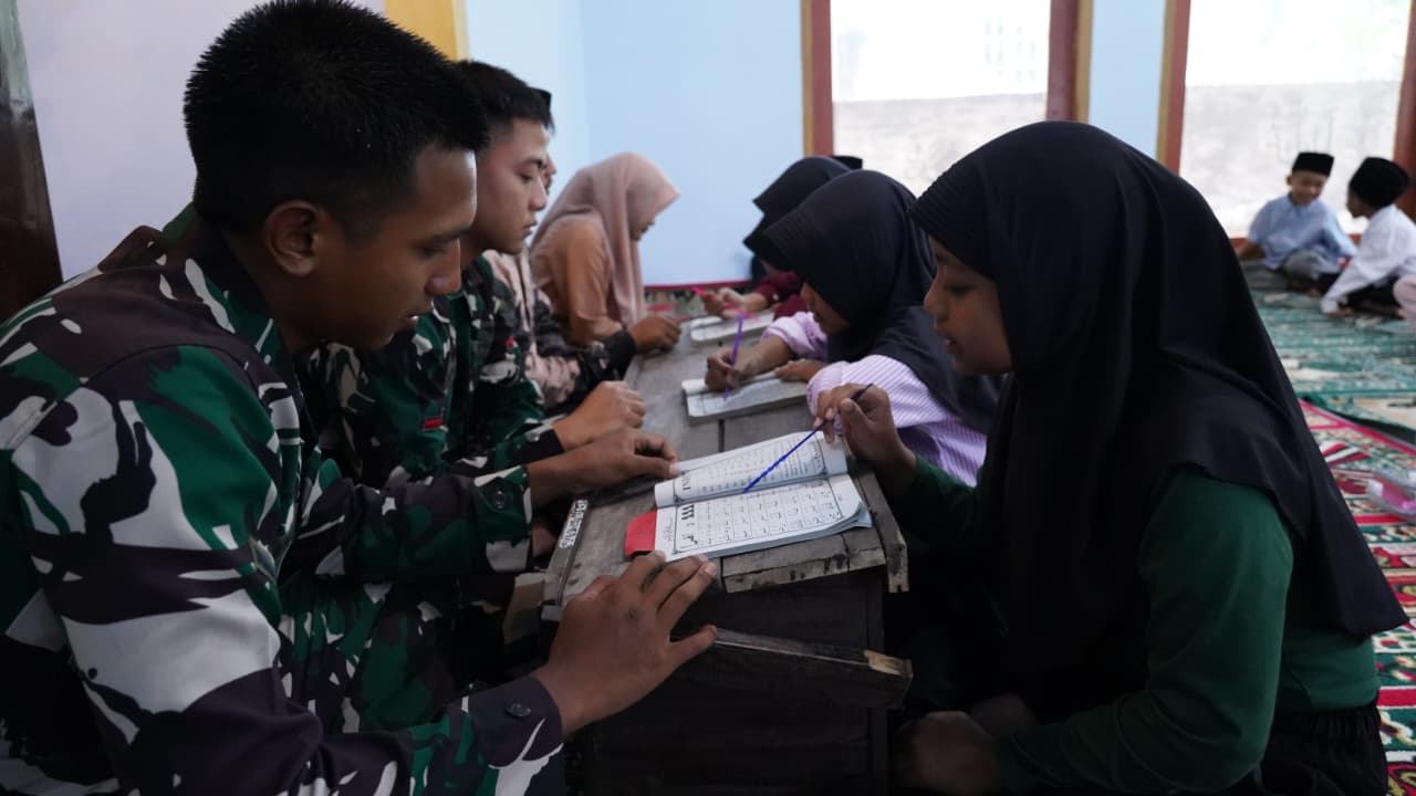 PukaNews, Blitar – Dalam rangka mewujudkan pembangunan fisik maupun nonfisik melalui program TNI Manunggal Membangun Desa (TMMD), anggota yang tergabung dalam Satgas TMMD ke-127 Kodim 0808/Blitar meluangkan waktu untuk mengajar anak-anak mengaji membaca Al-Qur”an. Kegiatan tersebut dilaksanakan di MQQ Al Muhaimin Dusun Barurejo Desa Krisik Kecamatan Gandusari Kabupaten Blitar, Jumat (13/2/2026).