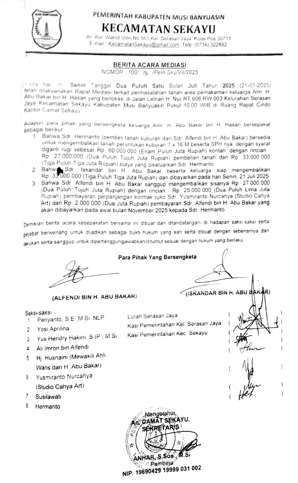 Ahli Waris, Iskandar Bin H. Abu Bakar, menghadiri mediasi tersebut. Setelah dilakukan pengukuran ulang, ditemukan adanya selisih kekurangan lahan sekitar 4 meter dari total yang dibeli Tafriansyah (20×27 meter).