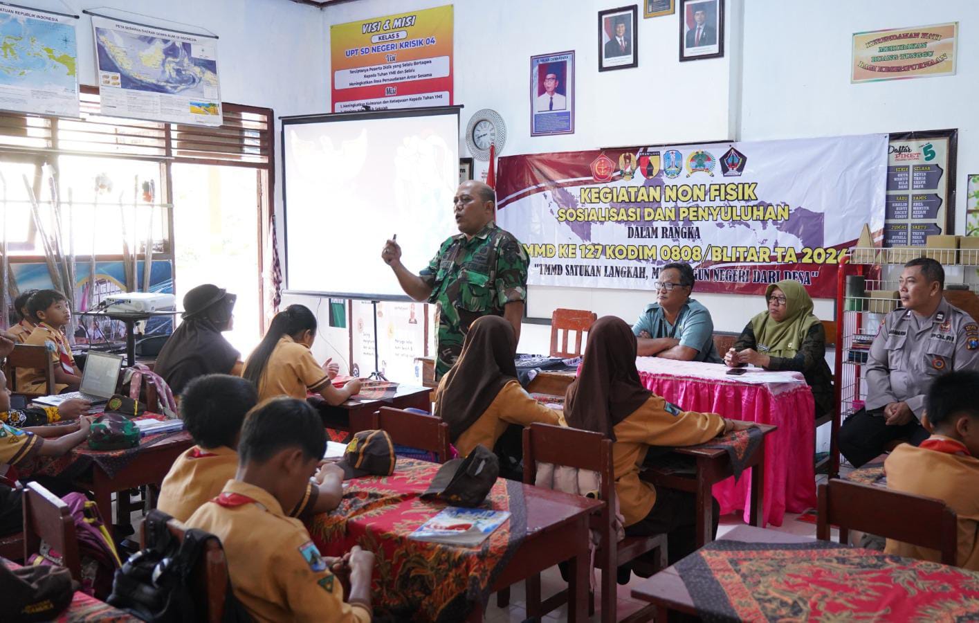 PukaNews, Blitar — Personel Satgas TNI Manunggal Membangun Desa (TMMD) ke-127 Kodim 0808/Blitar terus menggencarkan sasaran non-fisik dengan memberikan pembekalan Wawasan Kebangsaan (Wasbang) kepada generasi muda. Kali ini, Kapten Inf Slamet memberikan materi langsung kepada siswa-siswi SDN Krisik 04 di Desa Krisik Kecamatan Gandusari Kabupaten Blitar, Jumat (6/3/2026).