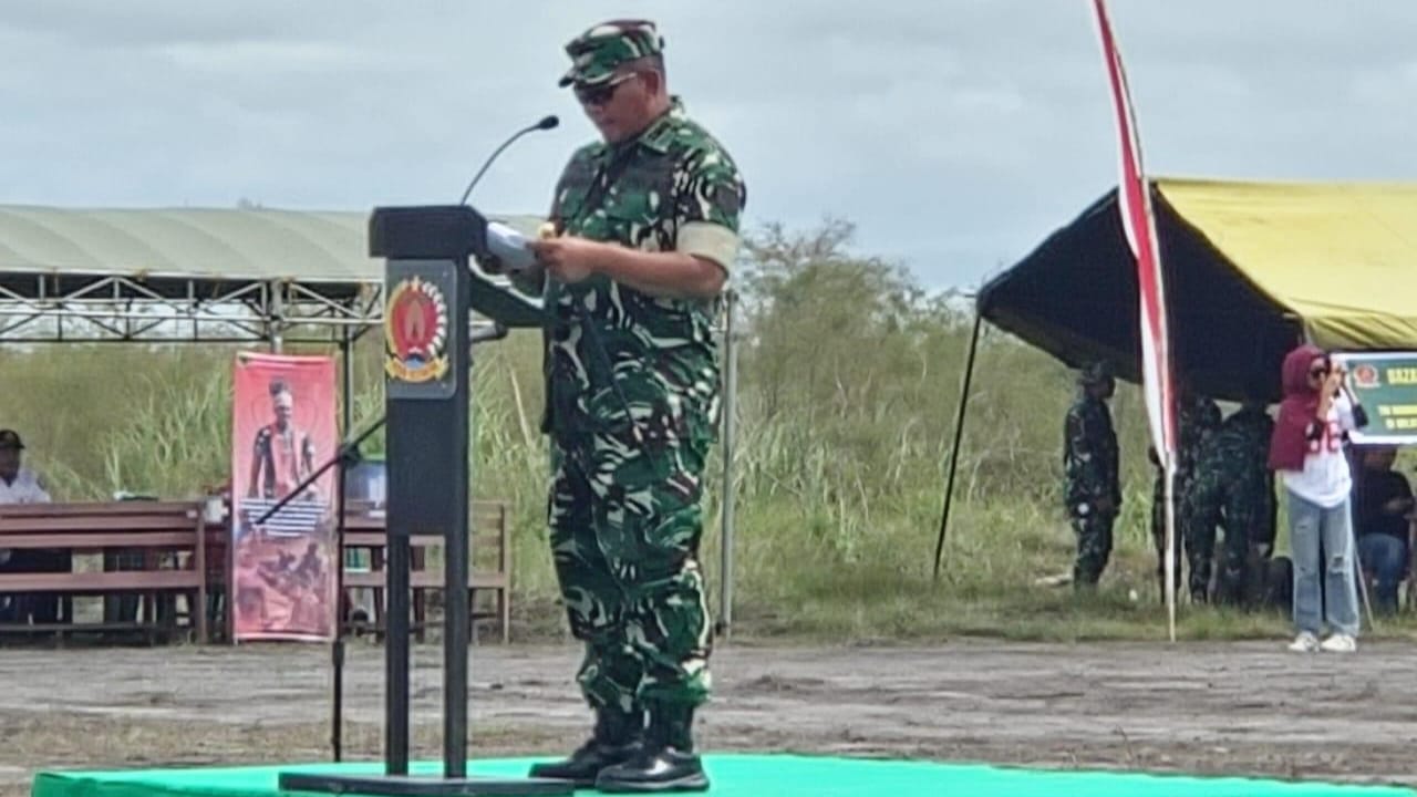 Komandan Korem 182/Jazirah Onim, Kolonel Inf Irwan Budiana, ketika membacakan Amanat Pangdam XVIII/Kasuari pada kegiatan penutupan TMMD Tahun ke- 125 di Kampung Warisa Mulya, Distrik Tomage, Kabupaten Fakfak Papua Barat. (Foto: Penrem 182/JO)