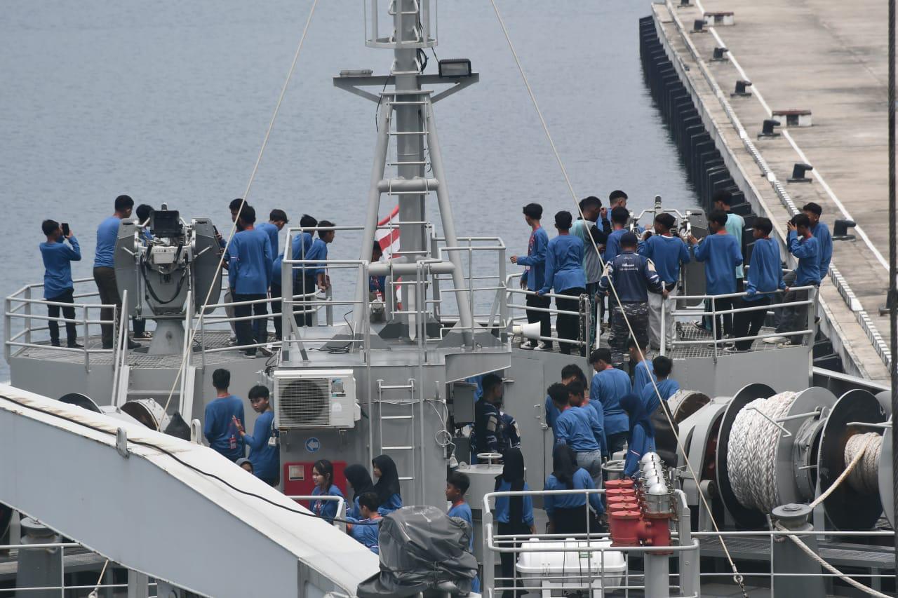 PUKANEWS.COM, LAMPUNG – Guna menambah wawasan tentang Kebangsaan mengenai kegiatan P5 (Projek Penguatan Profil Pelajar Pancasila) dan semangat kebaharian dengan memperkenalkan tugas prajurit TNI AL khususnya di kapal perang, ratusan siswa – siswi SMPN 30 Bandar Lampung mengunjungi Kapal Perang Republik Indonesia (KRI) Bontang-907 yang sedang sandar di Dermaga Mako Lanal Lampung, Caligi. (13/4/2025).