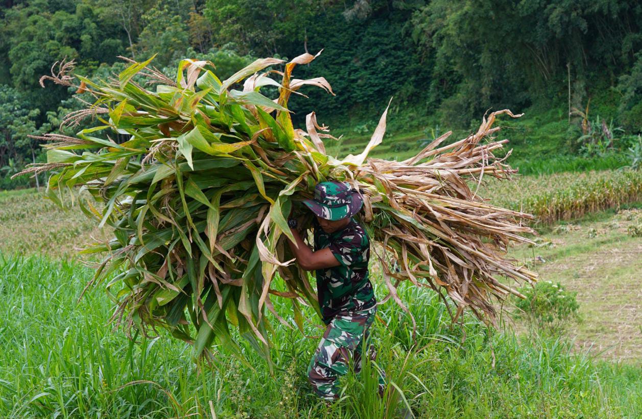 Pemandangan ini menjadi bukti bahwa semangat pengabdian TNI tidak terbatas pada proyek konstruksi semata. Di sela waktu istirahat pengerjaan jalan, para prajurit yang melihat warga kesulitan membawa beban rumput yang berat langsung turun tangan membantu memanggul pakan tersebut melewati medan yang cukup terjal.
