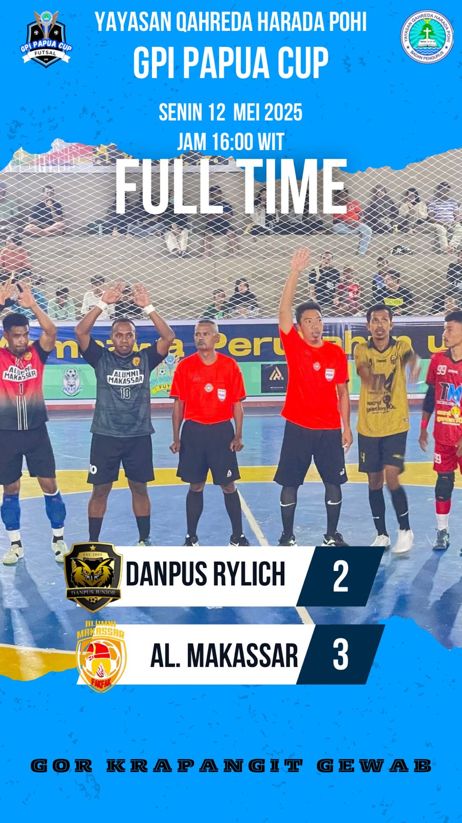 PUKANEWS.COM, FAKFAK – Alumni Makassar FC mencatat kemenangan dramatis atas Danpus FC dengan skor tipis 3-2 dalam laga Open Turnamen Futsal Yayasan Qahreda Harada Pohi GPI Papua Cup yang digelar di GOR Krapangit Gewap, Senin (12/5/2025).