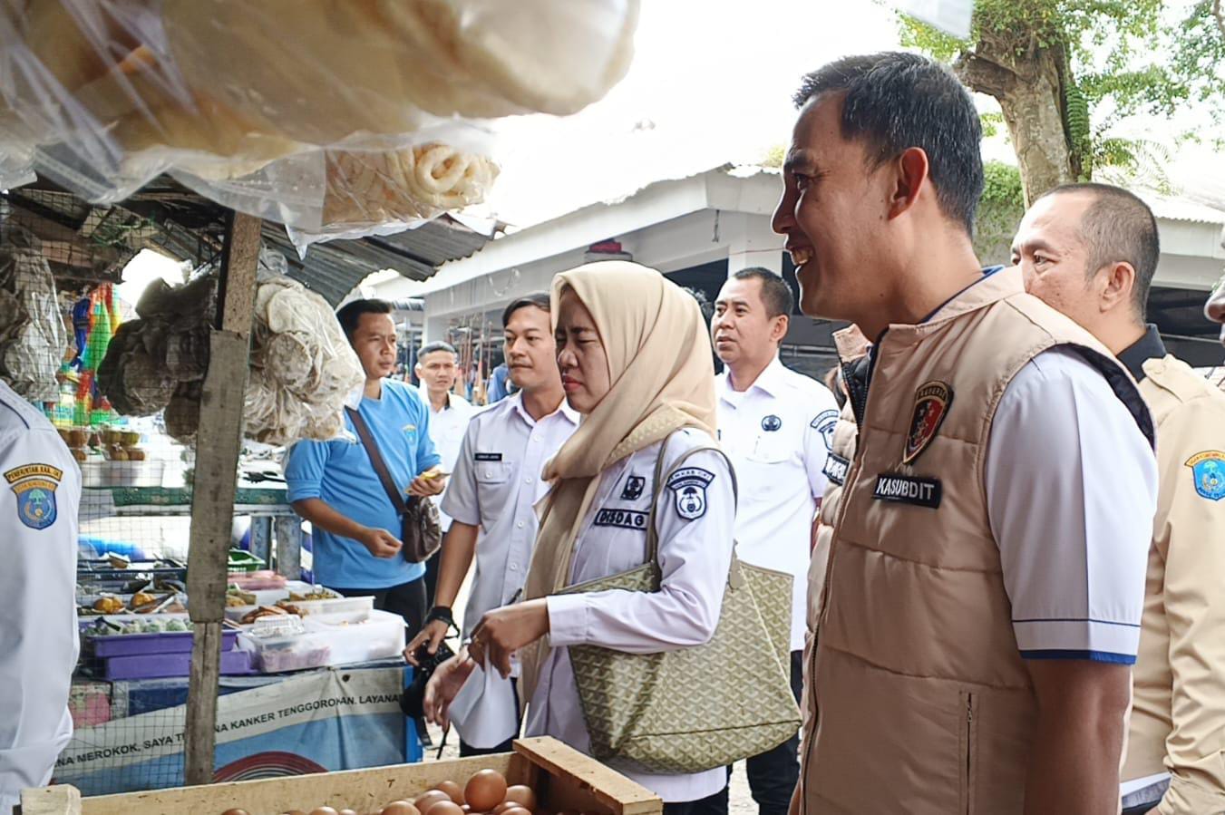 Rombongan ini berkeliling menyisir pasar menyapa pedagang satu persatu untuk mempertanyakan harga sekaligus stok sembako yang ada terlebih di bulan suci ramadhan dan jelang hari raya idulfitri nanti.