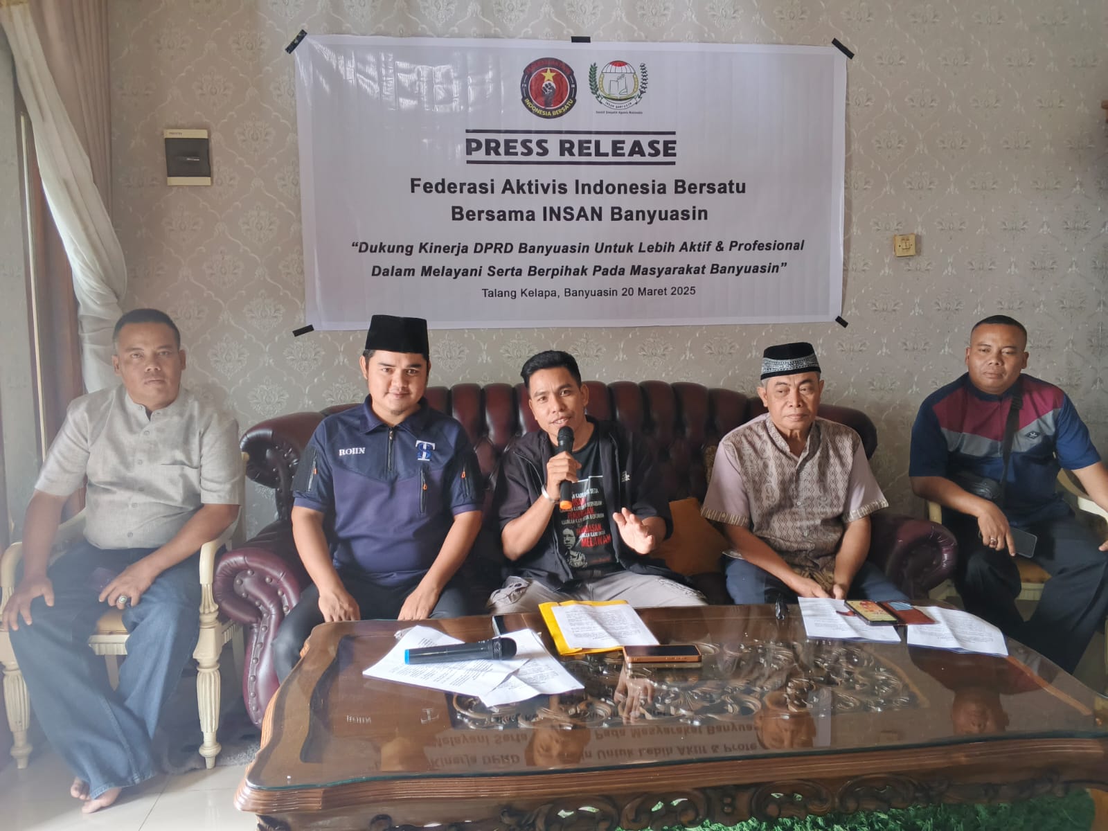 PukaNews.com, BANYUASIN – Federasi Aktivis Indonesia Bersatu (FAIB) dan Ikatan Nasional Aktivis dan Simpatisan Anti Narkoba (INSAN) Banyuasin secara terbuka menyatakan dukungan mereka terhadap kinerja Dewan Perwakilan Rakyat Daerah (DPRD) Kabupaten Banyuasin. Pernyataan dukungan ini disampaikan dalam sebuah konferensi pers yang diadakan di Talang Kelapa, Kabupaten Banyuasin, pada Kamis, 20 Maret 2025. Langkah ini diambil sebagai respons terhadap berbagai isu yang berkembang di media sosial dan di tengah masyarakat Banyuasin terkait kinerja lembaga legislatif tersebut.
