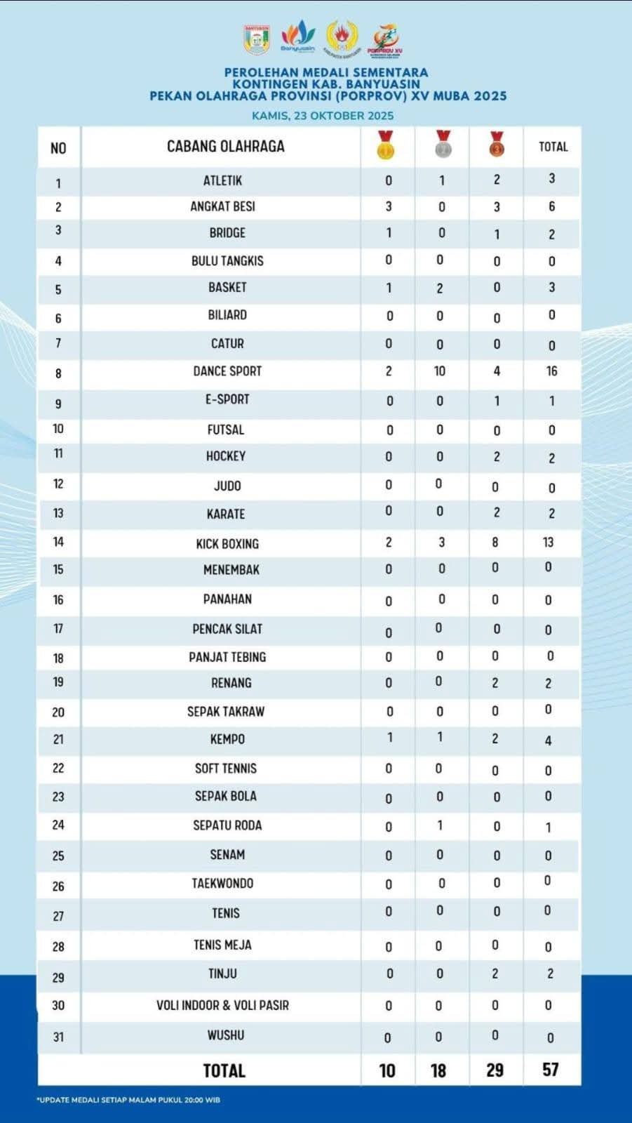 MUSI BANYUASIN, PUKANEWS — Panggung Pekan Olahraga Provinsi (Porprov) XV Sumatera Selatan 2025 di Kabupaten Musi Banyuasin (Muba), seakan menjadi ajang unjuk gigi bagi Kabupaten Banyuasin. Hingga Rabu malam (23/10/2025) pukul 22.00 WIB, kontingen muda Bumi Sedulang Setudung sukses mengguncang klasemen sementara dengan torehan medali sebanyak 59 terdiri dari, 10 emas, 18 perak, dan 31 perunggu dengan bertengger di peringkat 12, dan hanya selisih tipis dari Kabupaten Pali.