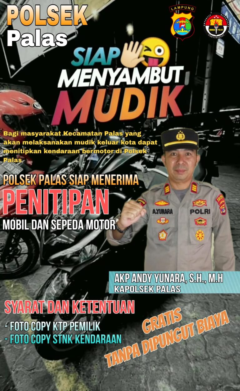 Lampung Selatan, Pukanews.com — Polsek Palas Jelang Hari Raya Idul Fitri 1445 H. membuka layanan penitipan kendaraan bermotor, baik roda dua maupun roda empat, bagi warga yang mudik ke kampung halamannya, selama libur lebaran 2024.