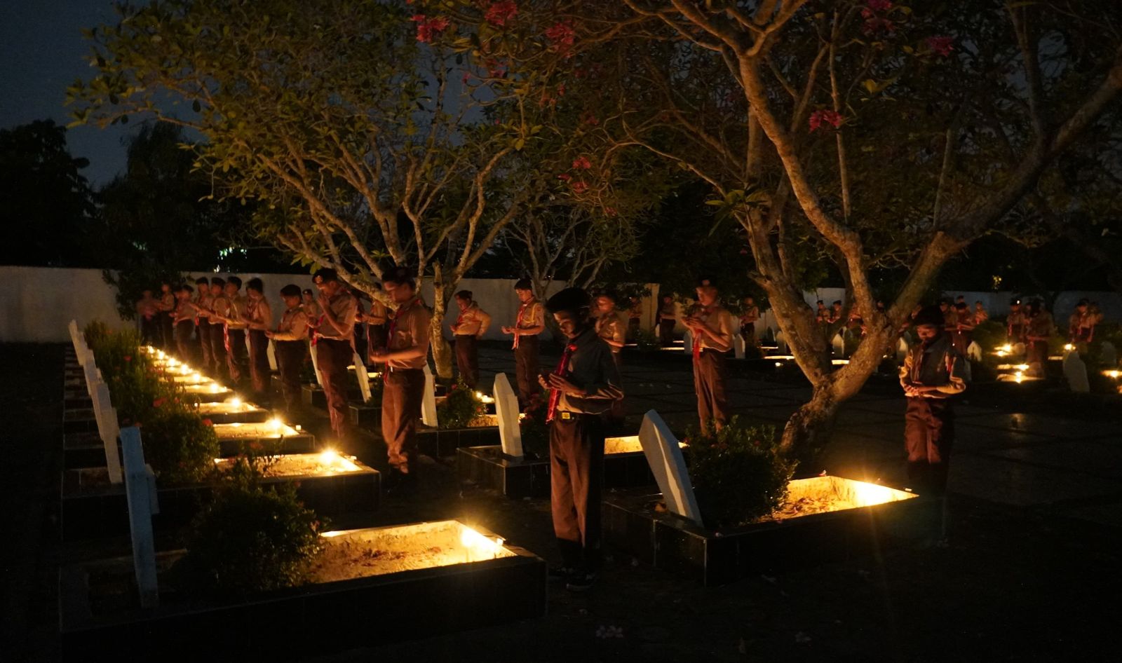 Kapolres OKI, AKBP Hendrawan Susanto, SH S.I.K bertindak selaku inspektur apel membacakan naskah apel kehormatan dan renungan suci dengan kondisi lampu taman makam dipadamkan dan sebagai penerang, dua obor dinyalakan.