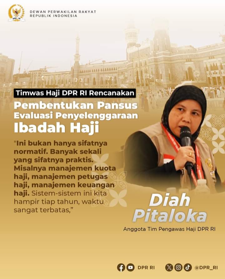 Anggota Timwas Haji DPR RI Diah Pitaloka, menyatakan bahwa Pansus Haji dibentuk untuk menangani berbagai aspek penting dalam manajemen haji, seperti kuota, anggaran, dan petugas haji.