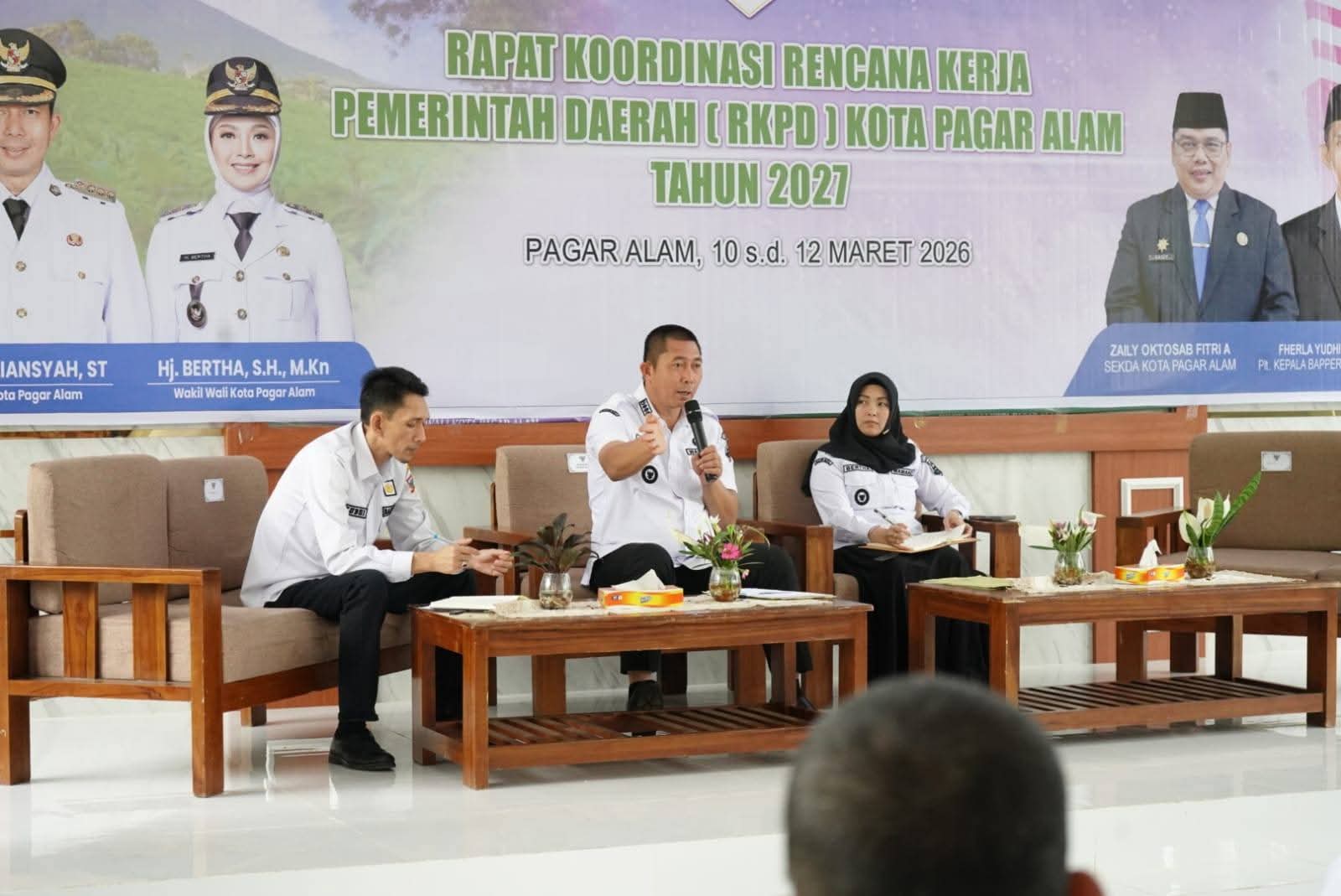 PukaNews, Pagar Alam — Wali Kota Pagar Alam Ludi Oliansyah bersama Wakil Wali Kota Pagar Alam Hj. Bertha, menghadiri Rapat Koordinasi Rencana Kerja Pemerintah Daerah (RKPD) tahun 2027, bertempat di balai pertemuan Rumah Dinas Wali Kota Pagar Alam, Rabu, (11/03/2026).